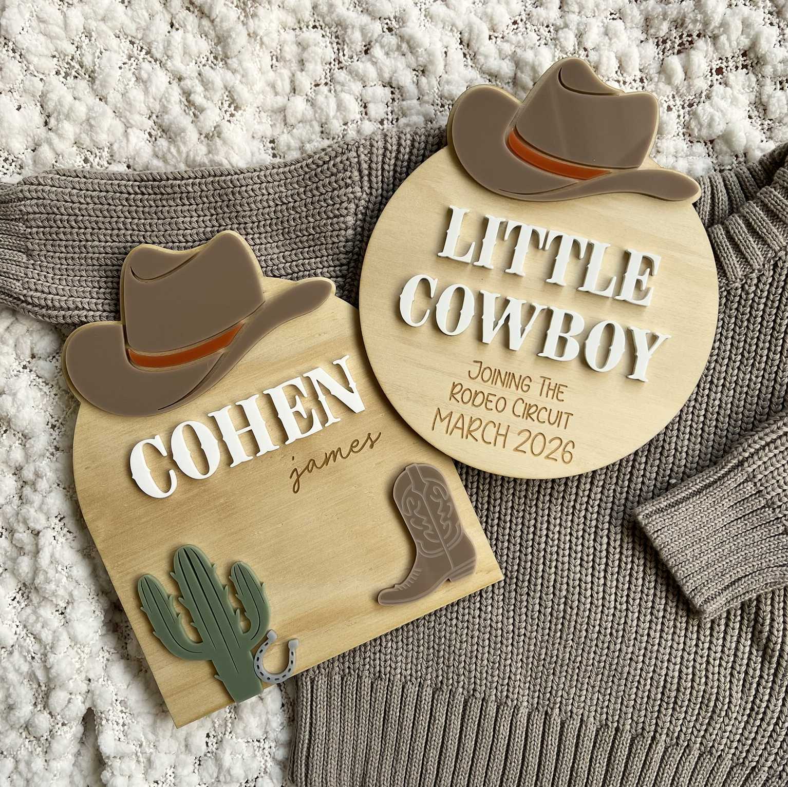 Announce the arrival of your little cowboy or cowgirl in rustic style with our Western inspired birth announcement sign. Handcrafted from 4mm plywood and 3mm acrylic, this keepsake is perfect for sharing your baby news and makes a beautiful photo prop.
